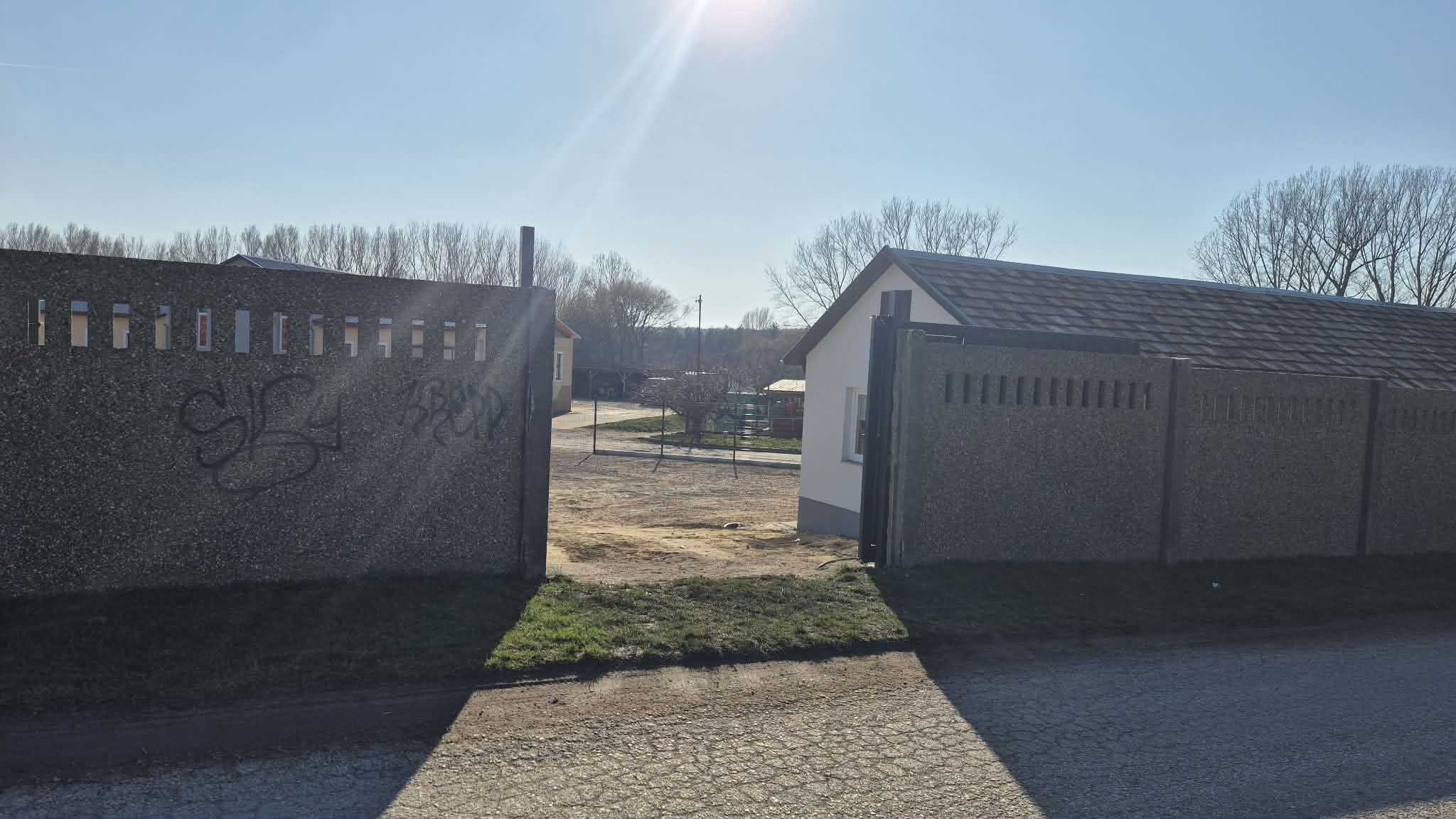 Az út mellett végig egy kőkerítés található. Ennek egy eleme ki van szedve – itt nyugodtan be tudsz jönni autóval, az udvaron pedig parkolási lehetőség is rendelkezésre áll.